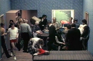 诺曼·麦克拉伦1952年的实验片《邻居》是典型的真人实物拍摄。该片首开真人逐格摄影的先例,这部作品为他赢得了一项奥斯卡奖。奥斯卡获奖短片《探戈》(见图2-7)讲述了在同一空间、不同时间出现的人们之间的行为关系,各种角色相互穿插又互不影响。